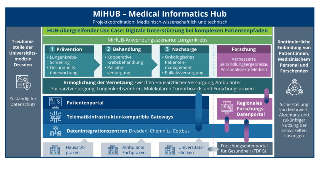 MiHUB verfolgt das Ziel, einen zentralen Hub für Forschende, Pflegekräfte und Patient:innen in Ostdeutschland zu etablieren, indem ein sektorübergreifender Datenraum geschaffen wird, der durch ein fortschrittliches Kommunikations-, Daten- und Forschungsnetzwerk unterstützt wird. Dieses Netzwerk verbindet die Datenintegrationszentren, die als Multiplikatoren für benachbarte Regionen fungieren, und ermöglicht die Forschung zu versorgungsorientierten Netzwerken. Das in der ersten Förderphase entwickelte Patientenportal wird erweitert, um die interprofessionelle und intersektorale Zusammenarbeit entlang des gesamten Versorgungskontinuums zu verbessern und Module kooperierender DigiHubs zu integrieren.